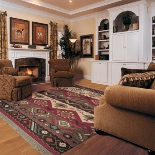 Artisan-made Kilim rug designed with traditional patterns and a smooth, reversible surface.